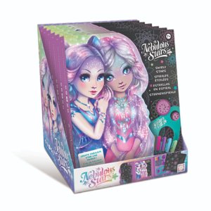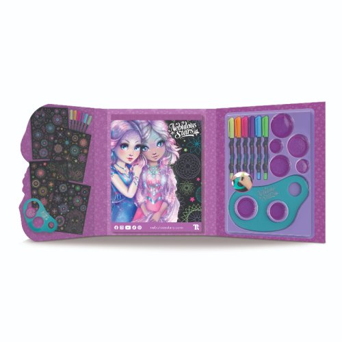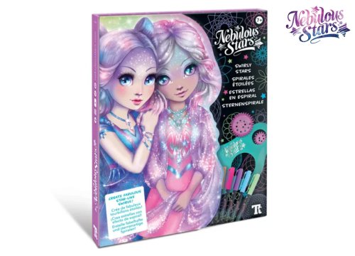 Nebulous Stars Maľuj hviezdne špirály set. Obsah balenia - 48 čiernych stránok, šablóna na špirály a 7 koliesok, 6 neónových gélových pier, stránka so samolepkami. 36 stránok má ilustrácie ktoré môžete vyfarbiť a doplniť špirálami.