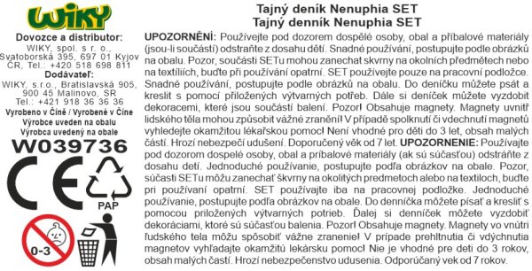 Nebulous Stars Tajný denník Nenuphia. Obsah - denník s 200 stránkami, zámok 6 farebné pero, ceruzka, strúhadlo, guma, 2 pečiatky, nálepky, aplikačné pero, pravítko, 2 klipy, magnetická záložka, notes so 150 linajkovými stránkami, 44 stránok aktivít, príbeh Nenuphia.