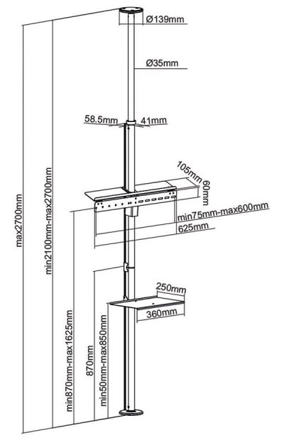 Stojan pre montáž televízie s uhlopriečkou 37 až 70" určený na upevnenie medzi podlahu a strop. Vďaka teleskopickej tyči je možné ho umiestniť do miestnosti s výškou 210 až 270 cm. Konštrukcia stojana umožňuje jednoduché nastavenie výšky od 87 do 162,5 centrimetrov pre otáčky a otáčania. komponenty alebo vstavaný systém správy kabeláže . Maximálna hmotnosť televízora je 30 kg , nosnosť police pre príslušenstvo činí 5 kg.