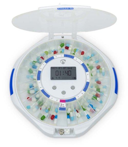 Automatický dávkovač na tablety je dokonalým riešením pre organizáciu a dávkovanie liekov, vitamínov a doplnkov stravy. Disponuje priehradkami a dávkovacími krúžkami pre automatické dávkovanie liekov 1–9× denne po dobu až 28 dní . Nutnosť vziať si lieky vám pripomenie svetelný a zvukový alarm s nastaviteľnou hlasitosťou. Uzamykateľné veko bráni neoprávnenému prístupu k liekom. Dávkovač je napájaný cez USB-C port pomocou pribaleného napájacieho adaptéra. V prípade cestovania či výpadku elektrického prúdu poslúži na napájanie dobíjacie Li-Ion batérie s kapacitou 2600 mAh a výdržou až 48 hodín . Nastavenie a vzdialený dohľad prebieha cez bezplatnú aplikáciu Nedis SmartLife .