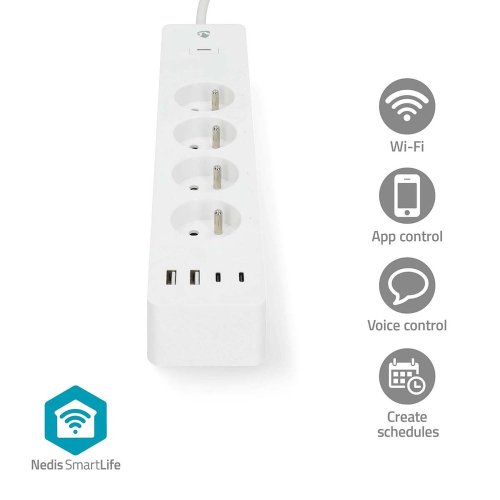Wi-Fi | 2x USB-A / 2x USB-C ™ / 4x plug with earth contact (CEE 7/5) | 16 A | 3680 W | 2.00 m | 0 - 55 °C | Android™ / IOS | Biela