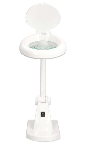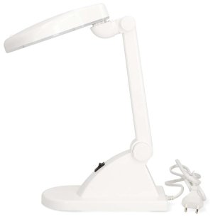 Konštrukcia z hliníka a plastu v bielom prevedení ponúka vertikálne sklopenie ramena a horizontálne otáčanie hlavice na presné nastavenie podľa potreby. Pevný podstavec s protišmykovými gumovými podložkami zaisťuje stabilné postavenie na stole. Ochranné viečko šošovky chráni pred prachom a slnečným svetlom pri nepoužívaní.