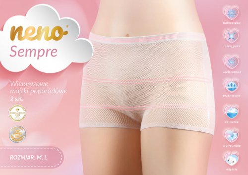 Nohavičky Neno Sempre sú navrhnuté pre mamičky, ktoré po pôrode hľadajú spoľahlivé, priedušné a pohodlné riešenie. Poskytujú ideálnu podporu popôrodným vložkám, chránia jazvu po cisárskom reze a sú vhodné na opakované použitie po celú dobu zotavovania.
