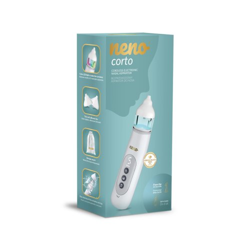 Neno Corto je moderná bezdrôtová nosová odsávačka určená pre dojčatá a batoľatá od narodenia. Je vybavená dvoma mäkkými vymeniteľnými koncovkami a jemne odstraňuje sekréty bez toho, aby dráždila citlivú nosovú sliznicu. Päť úrovní sacieho výkonu umožňuje presne nastaviť sací výkon podľa veku a potrieb vášho dieťaťa, zatiaľ čo farebné LED svetlá a tri melódie pomáhajú rozptýliť vaše dieťa a znižujú stres počas procedúry.