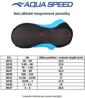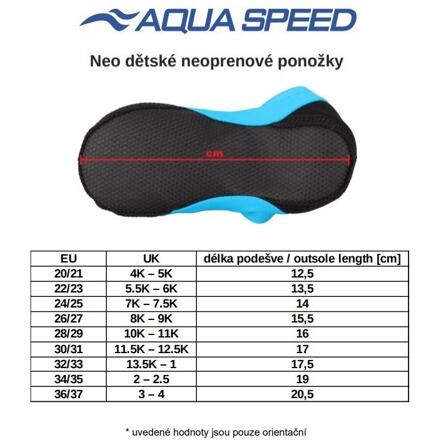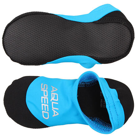 Detské neoprénové ponožky Aqua-Speed Neo sú viac, než len zaujímavý doplnok pre deti na pláž alebo k bazénu. Ponožky sú skladné, ľahké, pohodlné, ľahko sa obúvajú, nebránia v prirodzenom pohybe a hlavne poskytujú ochranu pred horúcim pieskom, chránia chodidlá na kamenistých plážach av prípade bazénov minimalizujú riziko pošmyknutia. Ponožky sú vyrobené z mäkkého a elastického materiálu v hornej časti a silnejšieho neoprénu na podrážke s protišmykovým povrchom. Material: Neoprén (50% Polyester 50% Guma SBR); 80% Polyamid 20% Elastan