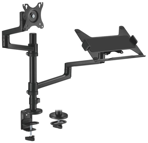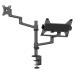 Flexibilný stolný VESA držiak pre notebook a plochý LCD monitor o veľkosti 17 "až 27" a hmotnosti do 8 kg + 5 kg notebook . Držiak je manuálne výškovo nastaviteľný v rozmedzí od 27,5 do 55,5 cm. Tento stolný držiak je vhodný pre obrazovky, ktoré spĺňajú vzor otvorov VESA 75 × 75, 75 × 100 a 100 × 100 mm. Rôzne vzory otvorov je možné pokryť pomocou VESA adaptérov (nie sú súčasťou balenia). Vďaka krátkemu hornému ramenu T-Rex je pri umiestnení v blízkosti steny nutná iba minimálna hĺbka. Poteší aj systém pre úhľadné vedenie káblov. Balenie obsahuje stolnú svorku aj priechodku.