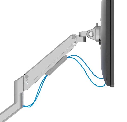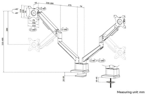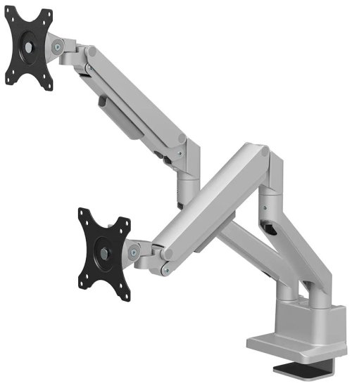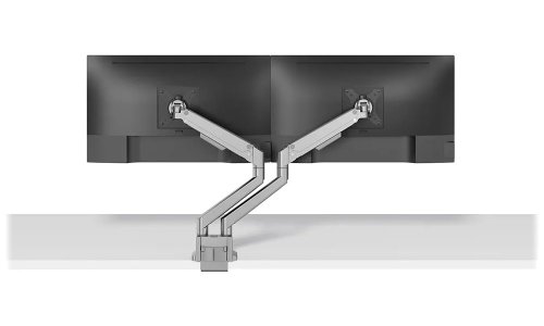 Plne pohyblivý stolný držiak pre dva ploché alebo zakrivené monitory s uhlopriečkou 17" až 32" a maximálnou hmotnosťou 18 kg (2× 9 kg) . Všestranná technológia naklápania, otáčania a rotácie umožňuje vytvoriť optimálny pozorovací uhol. Držiak má nastaviteľnú výšku 21,5–49,5 cm , hĺbku 7–52,5 cm a je vhodný pre obrazovky, ktoré zodpovedajú vzoru otvorov VESA 75 × 75 až 100 × 100 mm . Poteší aj systém pre úhľadné vedenie káblov. Balenie obsahuje stolnú svorku aj priechodku.
