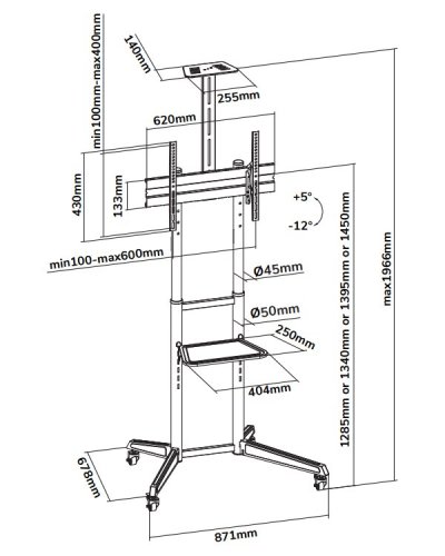 Mobilný podlahový stojan pre ploché obrazovky s uhlopriečkou od 37" do 70" a hmotnosťou až 50 kg . Stojan má 4 výškové nastavenia a možnosť náklonu (17 °) pre vytvorenie optimálneho pozorovacieho uhla. Navyše obsahuje samostatnú a výškovo nastaviteľnú policu pre príslušenstvo.