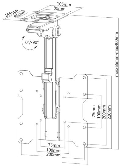 Stropný VESA držiak pre ploché LCD monitory a TV s uhlopriečkou od 10 "do 40" a hmotnosťou až 20 kg . Náklon až o 90 ° umožňuje nastaviť najlepší uhol pohľadu. Držiak je manuálne výškovo nastaviteľný v rozmedzí od 26,5 do 40 cm a je vhodný pre obrazovky alebo televízie, ktoré spĺňajú vzor otvorov VESA 75 × 75 až 200 × 200 mm .