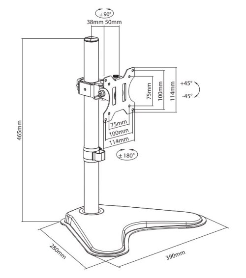 Stolný VESA držiak pre plochý LCD monitor o veľkosti 13 "až 32" a hmotnosti do 8 kg . Držiak je manuálne výškovo nastaviteľný v rozmedzí od 5,6 do 41,9 cm. Tento stolný držiak je vhodný pre obrazovky, ktoré spĺňajú vzor otvorov VESA 75 × 75 alebo 100 × 100 mm. Rôzne vzory otvorov je možné pokryť pomocou VESA adaptérov. Všetok inštalačný materiál je súčasťou výrobku.