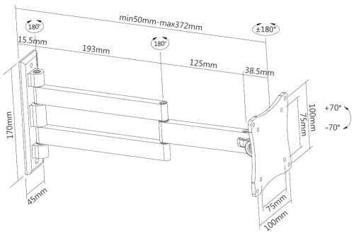Sklopný a otočný nástenný držiak pre ploché obrazovky s uhlopriečkou od 10" do 27" a hmotnosťou až 12 kg umožňuje ľahké nastavenie náklonu aj horizontálneho otočenia monitora. Hĺbka držiaka je nastaviteľná od 5 do 37 cm. Možnosť náklonu -70 ° až +70 ° a otáčanie -90 ° až +90 ° umožňuje nastaviť ten najlepší uhol pohľadu pre maximálnu flexibilitu pri sledovaní obrazovky. Držiak je kompatibilný so štandardmi VESA 75 × 75 až 100 × 100 mm .