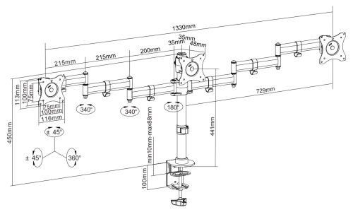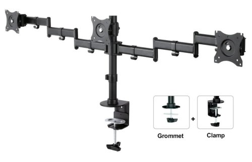 Flexibilný stolný VESA držiak pre 3 ploché LCD monitory o veľkosti 10 "až 27" a hmotnosti do 24 kg (3× 8 kg) . Držiak je manuálne výškovo nastaviteľný v rozmedzí od 0 do 49,8 cm. Stolový držiak je vhodný pre obrazovky, ktoré spĺňajú vzor otvorov VESA 75 × 75 alebo 100 × 100 mm. Rôzne vzory otvorov je možné pokryť pomocou VESA adaptérov. Všetok inštalačný materiál je súčasťou výrobku.