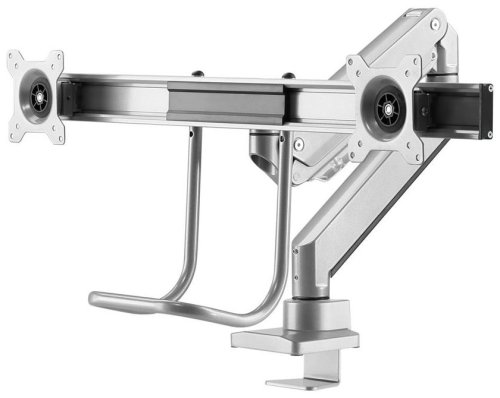 Flexibilný stolný VESA držiak s rukoväťou pre 2 ploché monitory o veľkosti 10 "až 32" a maximálnej nosnosti do 16 kg (2× 8 kg) . Univerzálna technológia naklápania, otáčania a rotácie umožňuje optimálne nastavenie. Všetok inštalačný materiál je súčasťou výrobku.