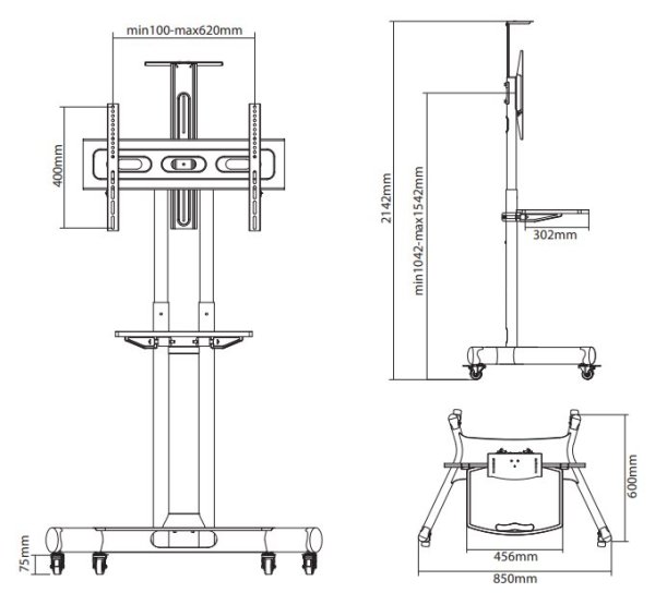Mobilný podlahový stojan pre ploché obrazovky s uhlopriečkou od 32" do 75" a hmotnosťou až 50 kg . Držiak je manuálne výškovo nastaviteľný v rozmedzí 104,2 až 154,2 cm. Navyše disponuje 2 policami pre príslušenstvo a kameru.