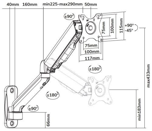 Nástenný VESA držiak je vhodný pre ploché LCD monitory o veľkosti 17 "až 32" a hmotnosti do 9 kg . Disponuje plynovým piestom na vyrovnanie záťaže a umožňuje jednoduché nastavenie optimálnej výšky, náklonu, horizontálneho otočenia aj zmenu orientácie na výšku (Pivot 360 °). Intuitívny systém správy kabeláže minimalizuje neporiadok.