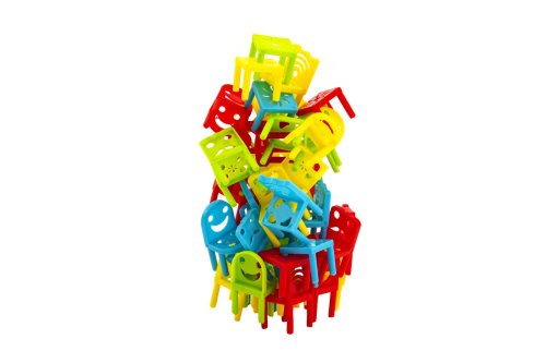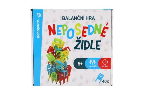 Každý hráč si vyberie jednu farbu a hra môže začať. Vyberte poradie, v ktorom budete hrať. Variant 1: Každé kolo hráč skladá jednu svoju stoličku do veže tak, aby balansovala, bola čo najvyššia a nespadla. Komu veža zo stoličiek spadne, prehral a hra začína odznova. Variant 2: V tomto variante hry sa stolička stavia rovnako, ale pri páde veže si hráč, ktorému sa zrútila, berie spadnuté stoličky a hra pokračuje ďalej. Vyhráva ten, kto sa najskôr zbaví všetkých stoličiek. Variant 3: Tento variant začína tým, že si každý hráč postaví pred seba stolček vo svojej farbe. Po odštartovaní každý hráč začne stavať svoju vlastnú vežu zo stoličiek. Komu veža spadne, vypadáva z hry. Vyhráva ten, komu zostane stáť najvyššia veža. Každý variant hry si môžete sťažiť tým, že budete pri stavaní používať iba jednu ruku. Môžete vymýšľať aj svoje vlastné pravidlá. Tvorenie sa medze nekladú. Neposedné stoličky rozvíja myslenie a jemnú motoriku dieťaťa. Pri balančnej hre Neposedné stoličky sa rozhodne nebudete nudiť! V balení je 32 ks plastových stoličiek a 8 ks stolčekov. Rozmer krabice: 23 x 21 x 6 cm Veľkosť stoličky: 5 cm Vhodné od 5 rokov