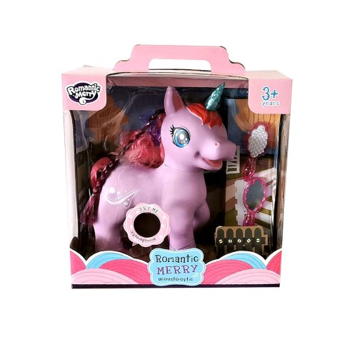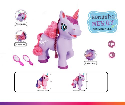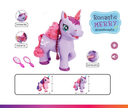 Jednorožec na batérie s príslušenstvom. Po stlačení tlačidla na brušku jednorožca začne vydávať zvuky a spievať anglickú pesničku a pri zvuku svieti roh. Príslušenstvo hrebienok na česanie dlhej hrivy a zrkadlo.