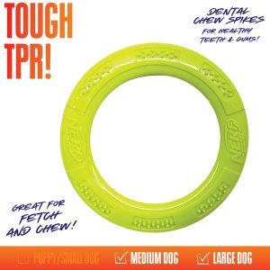 Hračka v tvare krúžku je určená na interaktívnu hru medzi psom a majiteľom – ideálna na preťahovanie („tug of lane“), aportovanie alebo zdieľanú hru. Je vyrobený z odolnej termoplastickej gumy (TPR), ktorá zaisťuje pevnosť a dlhotrvajúci výkon aj pri intenzívnejšej hre. Povrch je opatrený malými hrotmi, ktoré stimulujú ďasná a pomáhajú čistiť zuby psa počas žuvania a ťahania. Hračka sa vyznačuje jasnými, dobre viditeľnými farbami, vďaka čomu ju ľahko nájdete pri vonkajšej hre – v tráve, v parku alebo na záhrade.