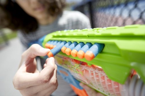 Zdvojnásobte radosť zo strieľania šípok s blastrom Nerf Elite 2.0 Double Punch! Tento motorizovaný bláster má totiž 2 hlavne a 2 zásobníky! Bláster Double Punch sa môže chváliť dvoma rýchlo sa striedajúcimi hlavami, ktoré sa pri streľbe pohybujú dopredu a späť. Súčasťou sú 2 zásobníky po 10 šípkach, takže to môžete rozbehnúť s 20 šípkami v rade. V balení nájdete hneď 50 penových šípok Nerf Elite 2.0, takže máte dostatočné množstvo, aby ste naplnili oba zásobníky po 10 kusoch a ďalšie šípky pripravili do úložného priestoru a mali ich tak po ruke pre ďalšie nabíjanie. Šípky sú dodávané v 2 rôznych farebných prevedeniach. Užite si akcie na plné obrátky vďaka motorizovanej streľbe. Stačí držať stlačené akceleračné tlačidlo a pri stlačení spúšte potom spustíte rýchlu paľbu. Deti budú nadšené - šípky rýchlo lietajú, hlaveň sa pohybuje dopredu a späť a hry vonku vďaka tomu získajú šťavu. Je to skvelý darček pre deti a perfektná hračka, pri ktorej budú deti v pohybe. Pri hraní sa odporúčajú okuliare (nie sú súčasťou balenia). Je potrebné 4x 1,5 V alkalických AA batérií (nie sú súčasťou balenia).