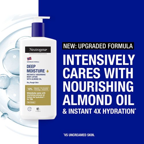Neutrogena NR Hĺbkovo hydratačné telové mlieko creamy oil poskytuje kombináciu intenzívnej a dlhotrvajúcej hydratácie a zamatovo hebkého dotyku oleja. Predstavuje ideálnu starostlivosť pre suchú pokožku. Hydratácia je znateľná už od prvého použitia a pôsobí po dobu 24 hodín. Vďaka účinnej nórskej receptúre dodáva aktívnu hydratáciu až do hĺbky 10 vrstiev pokožky. Je obohatené o sezamový olej, ktorý pokožku zjemňuje a zanecháva ju zamatovo hebkú. Má sviežu jemnú vôňu a príjemnú konzistenciu, ktorá nelepí a okamžite sa vstrebáva. Nezanecháva pocit mastnej pokožky.