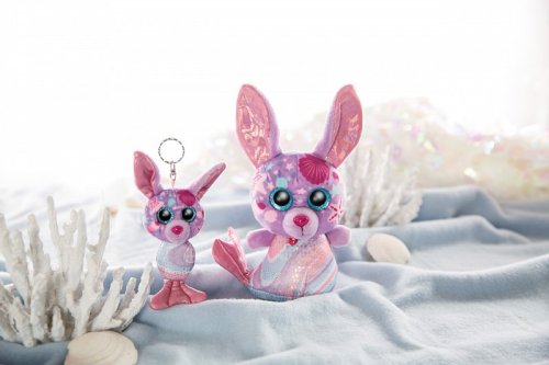Zajačik GLUBSCHIS Shellina má dlhé uši, ktoré sú podšité ružovou trblietavou látkou. Farebná králičia hlava je zdobená morskými motívmi, ako sú mušle a hviezdice, a preto skutočne upúta. Preto je zajačik GLUBSCHIS v štýle morskej panny jednoducho neporovnateľne roztomilý a možno ho vziať všade ako prívesok na kľúče, batoh či kabelku. Výška: 12 cm Vek: 3+