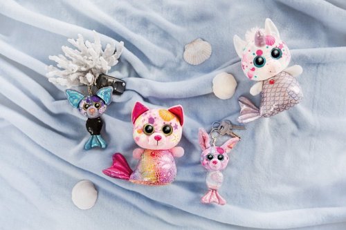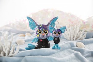 GLUBSCHIS Netopier z edície Mermaid je absolútne očarujúce. Modrá a čierna trblietavá látka a veľké zlaté trblietavé oči robia z prívesku na kľúče v štýle netopierej morskej panny niečo veľmi špeciálne. Výška: 12cm. Vek: 3+