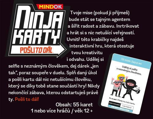 Intrikovať a hrať sa s nič netušiacou verejnosťou. Vnútri tejto krabičky nájdeš interaktívnu hru, ktorá otestuje tvoju kreativitu aj odvahu. Urob si selfie s neznámym človekom, daj darček „len tak”, poraz súpera v dueli. Splň danú úlohu a pošli kartu ďalej nič netušiacemu človeku, ktorý sa vďaka tebe stane súčasťou hry! Nikdy nekončiaca zábava, ktorú odštartuješ práve ty. Pošli to ďalej!