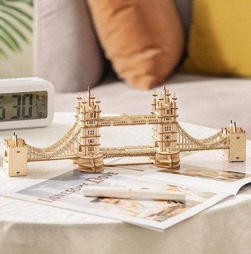 Drevené 3D puzzle. Zostav si prepracovaný model anglického Tower Bridge s krásnymi detailmi a LED osvetlením za pomoci obrázkového návodu. V balení sa nachádzajú drevené dosky s laserom predrezanými dielmi, ktoré do seba zapadajú. Rozmery poskladaného modelu sú 360x75x117 mm. Vhodné pre manuálnych zručných ľudí 14+.