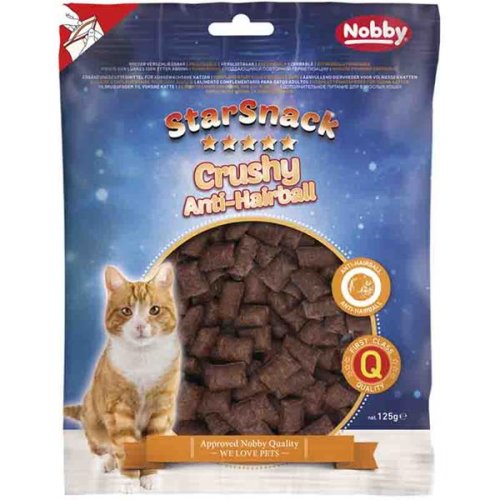Prírodné maškrty Nobby Starsnack pre dospelé mačky na podporu trávenia a priechodnosť chlpových zmotkov. Krehké vankúšiky plnené krémovou náplňou s prírodnou vlákninou a taurínom. Maškrty sú lahodnou pochúťkou pre každú mačku. Sú vyrobené z prírodných surovín, a preto sú mačkou veľmi dobre prijímané. Zloženie: cereálie, mäso a živočíšne produkty, oleje a tuky, rastlinné bielkoviny, vedľajšie rastlinné produkty (3% lignocelulóza), minerály. Analytické zložky: hrubý proteín 30 %, obsah tuku 20 %, hrubý popol 5,5 %, hrubá vláknina 4 %. Nutričné doplnkové látky na 1 kg: vit. A 10000 IU, vit. D3 650 IU, vit. E 90 mg, taurín 100 mg. Doplnené o antioxidanty. Dávkovanie: Podávajte ako maškrtu, max. 15 ks za deň. Podávajte pod dohľadom, ideálne z ruky ako odmenu a maškrtu na základe vyváženej stravy. Nezabúdajte na prístup čerstvej vody.
