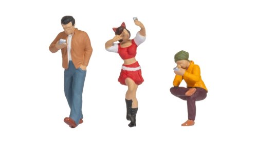 Táto moderná a ľahko satirická scénka prináša do vašej modelovej krajiny obraz každodennej reality dnešnej doby. Tri postavy, naplno pohrúžené do sveta svojich chytrých telefónov, si nevšímajú okolie. Muž vľavo kráča zamyslene so sklonenou hlavou, úplne uprený na displej. Uprostred pózuje mladá žena s čelenkou s uškami a zaobstaráva si selfie v typickej póze. Tretia sediaca postava sústredene hľadí do mobilu, ako by okolitý svet ani neexistoval. Táto scénka skvele zapadne do mestských priestorov, peších zón, parkov alebo zastávok, a prinesie na vašu železnicu štipku súčasného života s humorom a nadsadením. Výborne spracované figúrky s výrazným charakterom dodajú každej dioráme autenticitu aj úsmevný moment. Hlavné vlastnosti: jedná sa o model, nejedná sa o hračku ručne kolorovaný vhodné od 14 rokov meradlo H0