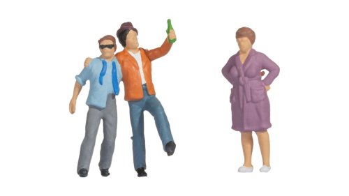 Sada figúrok Veselí kamaráti prinášajú na vašu modelovú železnicu zábavnú a veľmi realistickú scénku. Dvaja dobrí kamaráti si zjavne užili príjemný večer a teraz sa v dobrej nálade, ruka v ruke as fliaš v ruke, vracajú domov. Na ich návrat už ale čaká tretia postava - rázna pani v župane so založenými rukami a prísnym pohľadom. Je zrejmé, že z ich nočného výletu nie je práve nadšená. Táto humorná scénka sa skvele hodí do mestských alebo dedinských zákutí vášho koľajiska a zaručene vykúzli úsmev na tvári každého pozorovateľa. Veselí kamaráti vnášajú do modelového sveta kúsok každodenného života s nadhľadom a vtipom. Hlavné vlastnosti: jedná sa o model, nejedná sa o hračkuručne kolorovanývhodné od 14 rokovmerítko H0