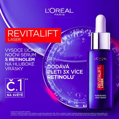 Nočné sérum s vysokou koncentráciou čistého retinolu redukuje aj hlboké vrásky. Zanechá pleť okamžite hydratovanú, pružnú a viditeľne hladšiu. Už za 1 mesiac používania bude textúra pleti jemnejšia, mladšia a žiarivejšia. Za 4 mesiace bude viditeľná redukcia hlbokých vrások o 36%.
