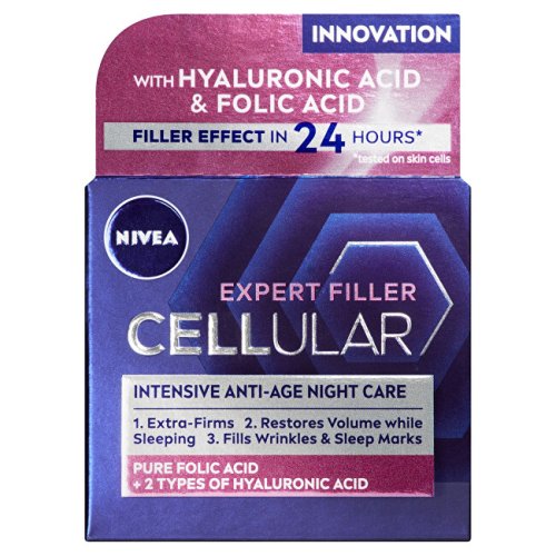Vybavte sa proti vráskam účinnými pomocníkmi: čistou kyselinou listovou a dvojakou kyselinou hyalurónovou. Efekt vyplnenia pleti uvidíte už za 24 hodín! NIVEA Nočný krém Cellular Expert Filler. Doprajte svojej pleti intenzívnu regeneráciu a vyhladenie aj v priebehu noci. Inovatívne zloženie s čistou kyselinou listovou a dvojitou kyselinou hyalurónovou (mikro a makro) viditeľne vyplní a vypne pleť už za 24 hodín! Zároveň ju intenzívne hydratuje. Čisté zloženie s luxusnou krémovou textúrou a ružovou farbou sa príjemne nanáša. Už za 4 týždne bude vaša pleť vyzerať mladšia a vďaka posilneniu kožnej bariéry môže účinne bojovať proti budúcim známkam starnutia. Starajte sa o seba aj v noci: NIVEA Nočný krém Cellular Expert Filler.