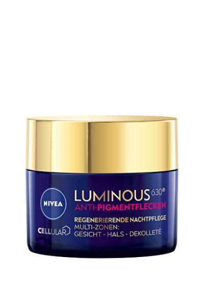 Zatiaľ čo cez deň musí naša pleť odolávať prachu, vetru, UV žiareniu a ďalším vplyvom, v noci má čas na regeneráciu. Tá je pre ňu veľmi dôležitá. Keď bude vaša pleť oddýchnutá, vráti vám to svojim sviežim vzhľadom. Nočný krém Cellular Luminous 630 obsahuje účinnú látku Luminous 630, ktorá okrem iného podporuje obnovu kožných buniek. Zároveň redukuje pigmentové škvrny a predchádza ich opätovnému vzniku. Kyselina hyalurónová sa zase postará o vyplnenie vrások a aktivuje kožné bunky. Doprajte svojej pleti odpočinok. Nočný krém Cellular Luminous 630 počas vášho spánku regeneruje pleť, posilňuje kožnú bariéru a redukuje pigmentové škvrny.