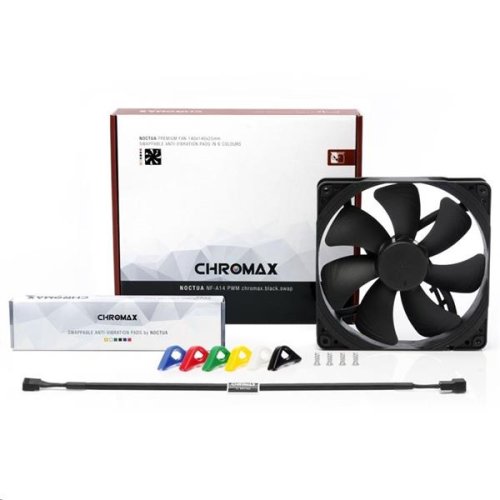 Vetráčik NF-A14 je jeden z najobľúbenejších 140-mm vetráčikov. Jeho štvorcová konštrukcia ho robí ideálnou pre použitie na radiátory vodného chladenia aj v skriniach. Edícia chromax.black.swap kombinuje tichý chod NF-A14 s vynikajúcim chladiacim výkonom a atraktívny celo-čierny dizajn s vymeniteľnými farebnými antivibračnými podložkami. Podložky sú k dispozícii vo farbe červená, biela, modrá, zelená, žltá a čierna a umožňujú farebne prispôsobiť vetráčik designu zvyšku skrine. Pre ešte väčšie doladenie designu Noctua ponúka ďalšie farebné príslušenstvo ako napríklad interné káble, antivibračné podložky, antivibračné úchyty atď., ktoré je možné dokúpiť samostatne.
