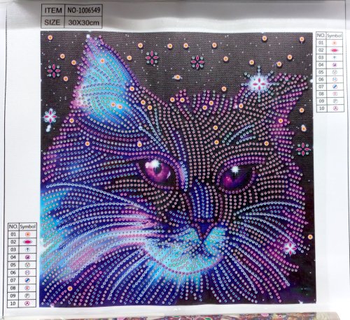 Balenie obsahuje: plátno s predtlačeným obrázkom, pero na aplikáciu kamienkov, misku na vysypanie kamienkov, vosk na nalepenie, sadu farebných kamienkov Diamantové maľovanie - postup: Horná strana plátna je potiahnutá lepidlom a prekrytá priehľadnou fóliou. Fóliu dávajte dole postupne po častiach tak, ako budete aplikovať kamienky. Pri sňatí celej fólie naraz sa môže lepiaca vrstva znečistiť a kamienky by nemuseli tak dobre držať. Plátno obsahuje znaky, ktoré sú uvedené v priloženej legende a odkazujú na príslušné vrecko s kamienkami označené číslom. Kamienky z daného vrecka vysypte do misky. Do hrotu pera naberte vosk, vďaka ktorému sa kamienky ľahko prichytia na pero. Kamienky perom nanášajte na obrázok. Po nalepení danej farby kamienky nasypte späť do vrecka a pokračujte s ďalšou farbou.