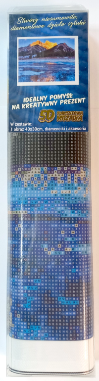 Balenie obsahuje: plátno s predtlačeným obrázkom, pero na aplikáciu kamienkov, misku na vysypanie kamienkov, vosk na nalepenie, sadu farebných kamienkov Diamantové maľovanie - postup: Horná strana plátna je potiahnutá lepidlom a prekrytá priehľadnou fóliou. Fóliu dávajte dole postupne po častiach tak, ako budete aplikovať kamienky. Pri sňatí celej fólie naraz sa môže lepiaca vrstva znečistiť a kamienky by nemuseli tak dobre držať. Plátno obsahuje znaky, ktoré sú uvedené v priloženej legende a odkazujú na príslušné vrecko s kamienkami označené číslom. Kamienky z daného vrecka vysypte do misky. Do hrotu pera naberte vosk, vďaka ktorému sa kamienky ľahko prichytia na pero. Kamienky perom nanášajte na obrázok. Po nalepení danej farby kamienky nasypte späť do vrecka a pokračujte s ďalšou farbou.