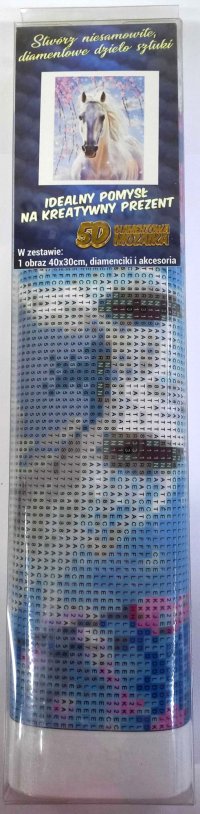 Balenie obsahuje: plátno s predtlačeným obrázkom, pero na aplikáciu kamienkov, misku na vysypanie kamienkov, vosk na nalepenie, sadu farebných kamienkov Diamantové maľovanie - postup: Horná strana plátna je potiahnutá lepidlom a prekrytá priehľadnou fóliou. Fóliu dávajte dole postupne po častiach tak, ako budete aplikovať kamienky. Pri sňatí celej fólie naraz sa môže lepiaca vrstva znečistiť a kamienky by nemuseli tak dobre držať. Plátno obsahuje znaky, ktoré sú uvedené v priloženej legende a odkazujú na príslušné vrecko s kamienkami označené číslom. Kamienky z daného vrecka vysypte do misky. Do hrotu pera naberte vosk, vďaka ktorému sa kamienky ľahko prichytia na pero. Kamienky perom nanášajte na obrázok. Po nalepení danej farby kamienky nasypte späť do vrecka a pokračujte s ďalšou farbou.