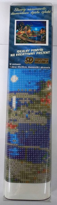 Balenie obsahuje: plátno s predtlačeným obrázkom, pero na aplikáciu kamienkov, misku na vysypanie kamienkov, vosk na nalepenie, sadu farebných kamienkov Diamantové maľovanie - postup: Horná strana plátna je potiahnutá lepidlom a prekrytá priehľadnou fóliou. Fóliu dávajte dole postupne po častiach tak, ako budete aplikovať kamienky. Pri sňatí celej fólie naraz sa môže lepiaca vrstva znečistiť a kamienky by nemuseli tak dobre držať. Plátno obsahuje znaky, ktoré sú uvedené v priloženej legende a odkazujú na príslušné vrecko s kamienkami označené číslom. Kamienky z daného vrecka vysypte do misky. Do hrotu pera naberte vosk, vďaka ktorému sa kamienky ľahko prichytia na pero. Kamienky perom nanášajte na obrázok. Po nalepení danej farby kamienky nasypte späť do vrecka a pokračujte s ďalšou farbou.