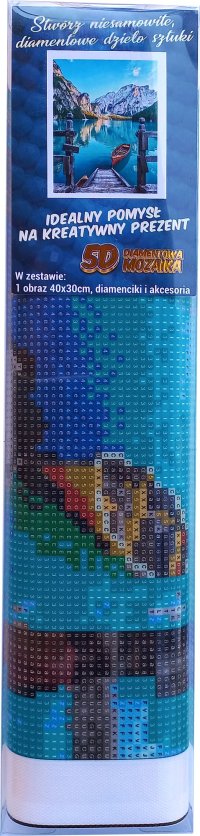 Balenie obsahuje: plátno s predtlačeným obrázkom, pero na aplikáciu kamienkov, misku na vysypanie kamienkov, vosk na nalepenie, sadu farebných kamienkov Diamantové maľovanie - postup: Horná strana plátna je potiahnutá lepidlom a prekrytá priehľadnou fóliou. Fóliu dávajte dole postupne po častiach tak, ako budete aplikovať kamienky. Pri sňatí celej fólie naraz sa môže lepiaca vrstva znečistiť a kamienky by nemuseli tak dobre držať. Plátno obsahuje znaky, ktoré sú uvedené v priloženej legende a odkazujú na príslušné vrecko s kamienkami označené číslom. Kamienky z daného vrecka vysypte do misky. Do hrotu pera naberte vosk, vďaka ktorému sa kamienky ľahko prichytia na pero. Kamienky perom nanášajte na obrázok. Po nalepení danej farby kamienky nasypte späť do vrecka a pokračujte s ďalšou farbou.