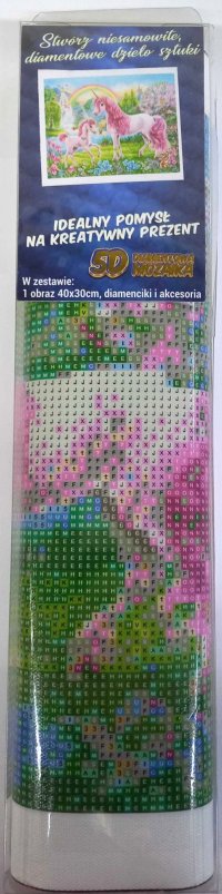 Balenie obsahuje: plátno s predtlačeným obrázkom, pero na aplikáciu kamienkov, misku na vysypanie kamienkov, vosk na nalepenie, sadu farebných kamienkov Diamantové maľovanie - postup: Horná strana plátna je potiahnutá lepidlom a prekrytá priehľadnou fóliou. Fóliu dávajte dole postupne po častiach tak, ako budete aplikovať kamienky. Pri sňatí celej fólie naraz sa môže lepiaca vrstva znečistiť a kamienky by nemuseli tak dobre držať. Plátno obsahuje znaky, ktoré sú uvedené v priloženej legende a odkazujú na príslušné vrecko s kamienkami označené číslom. Kamienky z daného vrecka vysypte do misky. Do hrotu pera naberte vosk, vďaka ktorému sa kamienky ľahko prichytia na pero. Kamienky perom nanášajte na obrázok. Po nalepení danej farby kamienky nasypte späť do vrecka a pokračujte s ďalšou farbou.