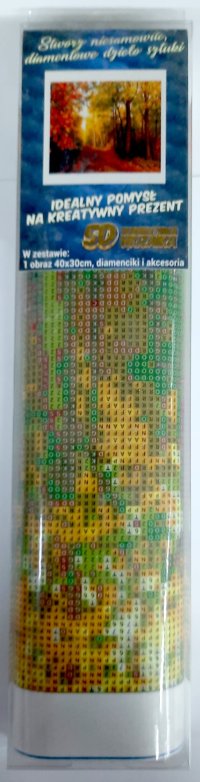 Balenie obsahuje: plátno s predtlačeným obrázkom, pero na aplikáciu kamienkov, misku na vysypanie kamienkov, vosk na nalepenie, sadu farebných kamienkov Diamantové maľovanie - postup: Horná strana plátna je potiahnutá lepidlom a prekrytá priehľadnou fóliou. Fóliu dávajte dole postupne po častiach tak, ako budete aplikovať kamienky. Pri sňatí celej fólie naraz sa môže lepiaca vrstva znečistiť a kamienky by nemuseli tak dobre držať. Plátno obsahuje znaky, ktoré sú uvedené v priloženej legende a odkazujú na príslušné vrecko s kamienkami označené číslom. Kamienky z daného vrecka vysypte do misky. Do hrotu pera naberte vosk, vďaka ktorému sa kamienky ľahko prichytia na pero. Kamienky perom nanášajte na obrázok. Po nalepení danej farby kamienky nasypte späť do vrecka a pokračujte s ďalšou farbou.