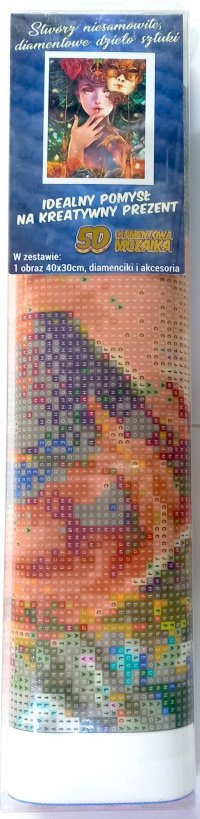 Balenie obsahuje: plátno s predtlačeným obrázkom, pero na aplikáciu kamienkov, misku na vysypanie kamienkov, vosk na nalepenie, sadu farebných kamienkov Diamantové maľovanie - postup: Horná strana plátna je potiahnutá lepidlom a prekrytá priehľadnou fóliou. Fóliu dávajte dole postupne po častiach tak, ako budete aplikovať kamienky. Pri sňatí celej fólie naraz sa môže lepiaca vrstva znečistiť a kamienky by nemuseli tak dobre držať. Plátno obsahuje znaky, ktoré sú uvedené v priloženej legende a odkazujú na príslušné vrecko s kamienkami označené číslom. Kamienky z daného vrecka vysypte do misky. Do hrotu pera naberte vosk, vďaka ktorému sa kamienky ľahko prichytia na pero. Kamienky perom nanášajte na obrázok. Po nalepení danej farby kamienky nasypte späť do vrecka a pokračujte s ďalšou farbou.