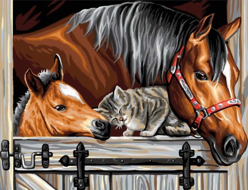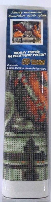 Balenie obsahuje: plátno s predtlačeným obrázkom, pero na aplikáciu kamienkov, misku na vysypanie kamienkov, vosk na nalepenie, sadu farebných kamienkov Diamantové maľovanie - postup: Horná strana plátna je potiahnutá lepidlom a prekrytá priehľadnou fóliou. Fóliu dávajte dole postupne po častiach tak, ako budete aplikovať kamienky. Pri sňatí celej fólie naraz sa môže lepiaca vrstva znečistiť a kamienky by nemuseli tak dobre držať. Plátno obsahuje znaky, ktoré sú uvedené v priloženej legende a odkazujú na príslušné vrecko s kamienkami označené číslom. Kamienky z daného vrecka vysypte do misky. Do hrotu pera naberte vosk, vďaka ktorému sa kamienky ľahko prichytia na pero. Kamienky perom nanášajte na obrázok. Po nalepení danej farby kamienky nasypte späť do vrecka a pokračujte s ďalšou farbou.