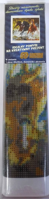 Balenie obsahuje: plátno s predtlačeným obrázkom, pero na aplikáciu kamienkov, misku na vysypanie kamienkov, vosk na nalepenie, sadu farebných kamienkov Diamantové maľovanie - postup: Horná strana plátna je potiahnutá lepidlom a prekrytá priehľadnou fóliou. Fóliu dávajte dole postupne po častiach tak, ako budete aplikovať kamienky. Pri sňatí celej fólie naraz sa môže lepiaca vrstva znečistiť a kamienky by nemuseli tak dobre držať. Plátno obsahuje znaky, ktoré sú uvedené v priloženej legende a odkazujú na príslušné vrecko s kamienkami označené číslom. Kamienky z daného vrecka vysypte do misky. Do hrotu pera naberte vosk, vďaka ktorému sa kamienky ľahko prichytia na pero. Kamienky perom nanášajte na obrázok. Po nalepení danej farby kamienky nasypte späť do vrecka a pokračujte s ďalšou farbou.