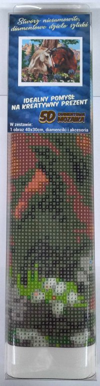 Balenie obsahuje: plátno s predtlačeným obrázkom, pero na aplikáciu kamienkov, misku na vysypanie kamienkov, vosk na nalepenie, sadu farebných kamienkov Diamantové maľovanie - postup: Horná strana plátna je potiahnutá lepidlom a prekrytá priehľadnou fóliou. Fóliu dávajte dole postupne po častiach tak, ako budete aplikovať kamienky. Pri sňatí celej fólie naraz sa môže lepiaca vrstva znečistiť a kamienky by nemuseli tak dobre držať. Plátno obsahuje znaky, ktoré sú uvedené v priloženej legende a odkazujú na príslušné vrecko s kamienkami označené číslom. Kamienky z daného vrecka vysypte do misky. Do hrotu pera naberte vosk, vďaka ktorému sa kamienky ľahko prichytia na pero. Kamienky perom nanášajte na obrázok. Po nalepení danej farby kamienky nasypte späť do vrecka a pokračujte s ďalšou farbou.