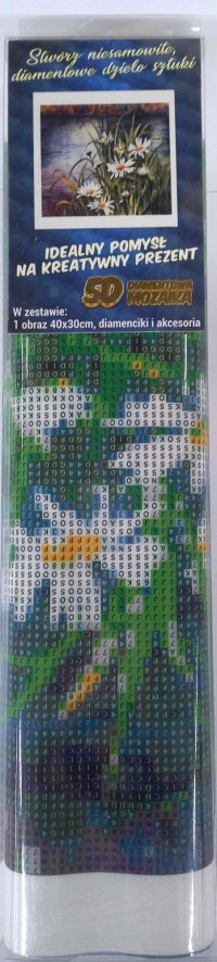 Balenie obsahuje: plátno s predtlačeným obrázkom, pero na aplikáciu kamienkov, misku na vysypanie kamienkov, vosk na nalepenie, sadu farebných kamienkov Diamantové maľovanie - postup: Horná strana plátna je potiahnutá lepidlom a prekrytá priehľadnou fóliou. Fóliu dávajte dole postupne po častiach tak, ako budete aplikovať kamienky. Pri sňatí celej fólie naraz sa môže lepiaca vrstva znečistiť a kamienky by nemuseli tak dobre držať. Plátno obsahuje znaky, ktoré sú uvedené v priloženej legende a odkazujú na príslušné vrecko s kamienkami označené číslom. Kamienky z daného vrecka vysypte do misky. Do hrotu pera naberte vosk, vďaka ktorému sa kamienky ľahko prichytia na pero. Kamienky perom nanášajte na obrázok. Po nalepení danej farby kamienky nasypte späť do vrecka a pokračujte s ďalšou farbou.
