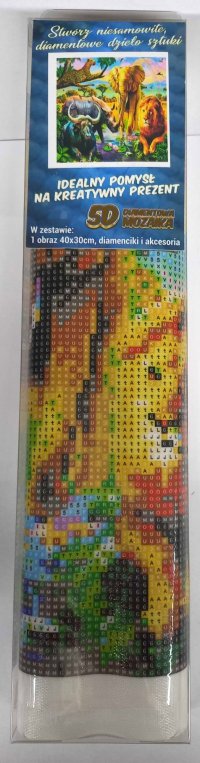 Balenie obsahuje: plátno s predtlačeným obrázkom, pero na aplikáciu kamienkov, misku na vysypanie kamienkov, vosk na nalepenie, sadu farebných kamienkov Diamantové maľovanie - postup: Horná strana plátna je potiahnutá lepidlom a prekrytá priehľadnou fóliou. Fóliu dávajte dole postupne po častiach tak, ako budete aplikovať kamienky. Pri sňatí celej fólie naraz sa môže lepiaca vrstva znečistiť a kamienky by nemuseli tak dobre držať. Plátno obsahuje znaky, ktoré sú uvedené v priloženej legende a odkazujú na príslušné vrecko s kamienkami označené číslom. Kamienky z daného vrecka vysypte do misky. Do hrotu pera naberte vosk, vďaka ktorému sa kamienky ľahko prichytia na pero. Kamienky perom nanášajte na obrázok. Po nalepení danej farby kamienky nasypte späť do vrecka a pokračujte s ďalšou farbou.