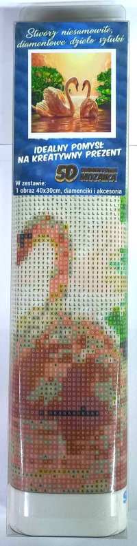 Balenie obsahuje: plátno s predtlačeným obrázkom, pero na aplikáciu kamienkov, misku na vysypanie kamienkov, vosk na nalepenie, sadu farebných kamienkov Diamantové maľovanie - postup: Horná strana plátna je potiahnutá lepidlom a prekrytá priehľadnou fóliou. Fóliu dávajte dole postupne po častiach tak, ako budete aplikovať kamienky. Pri sňatí celej fólie naraz sa môže lepiaca vrstva znečistiť a kamienky by nemuseli tak dobre držať. Plátno obsahuje znaky, ktoré sú uvedené v priloženej legende a odkazujú na príslušné vrecko s kamienkami označené číslom. Kamienky z daného vrecka vysypte do misky. Do hrotu pera naberte vosk, vďaka ktorému sa kamienky ľahko prichytia na pero. Kamienky perom nanášajte na obrázok. Po nalepení danej farby kamienky nasypte späť do vrecka a pokračujte s ďalšou farbou.