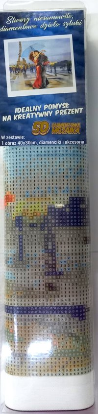 Balenie obsahuje: plátno s predtlačeným obrázkom, pero na aplikáciu kamienkov, misku na vysypanie kamienkov, vosk na nalepenie, sadu farebných kamienkov Diamantové maľovanie - postup: Horná strana plátna je potiahnutá lepidlom a prekrytá priehľadnou fóliou. Fóliu dávajte dole postupne po častiach tak, ako budete aplikovať kamienky. Pri sňatí celej fólie naraz sa môže lepiaca vrstva znečistiť a kamienky by nemuseli tak dobre držať. Plátno obsahuje znaky, ktoré sú uvedené v priloženej legende a odkazujú na príslušné vrecko s kamienkami označené číslom. Kamienky z daného vrecka vysypte do misky. Do hrotu pera naberte vosk, vďaka ktorému sa kamienky ľahko prichytia na pero. Kamienky perom nanášajte na obrázok. Po nalepení danej farby kamienky nasypte späť do vrecka a pokračujte s ďalšou farbou.